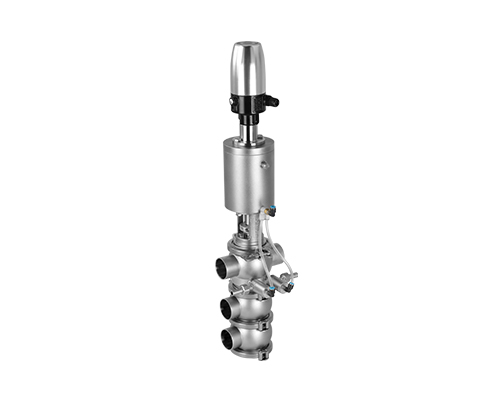 E-C系列防混閥主要由執(zhí)行機構、連接支架、閥桿、閥體組成,閥桿通過執(zhí)行器機構驅動做軸向直線運動,閥桿向上運動時,上下管路通道開啟;閥桿向下運動時,通道關閉。閥桿上設計有兩道密封圈與閥體密封面形成獨立的密封腔,與CIP閥相通,可用于密封檢漏;或上下管路流通不同介質時起到防混監(jiān)測的作用。